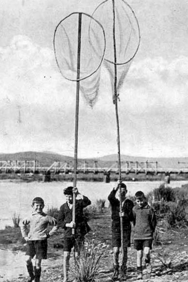 On an island in the Hokitika River - boys posing with their home- made scoop nets.1932.