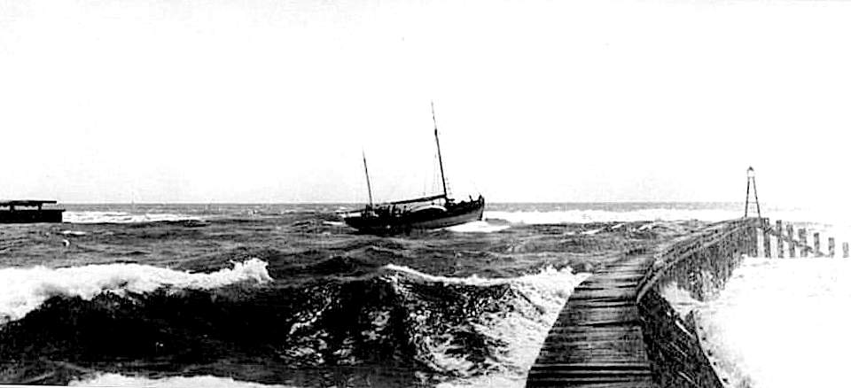 The 15 ton boat named Wakaiti, crossing the bar in Hokitika. 1910.