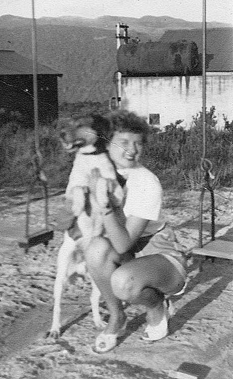 Ann Trotter at the playground between bathhouse and tennis court Denniston.ca.1957.