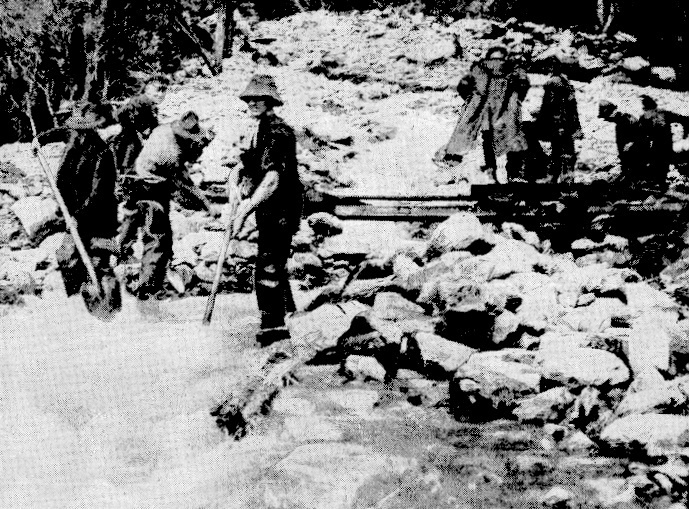 Roadworkers clearing away an extensive slip at Rocky Creek near Jacksons. 5 March,1940.
