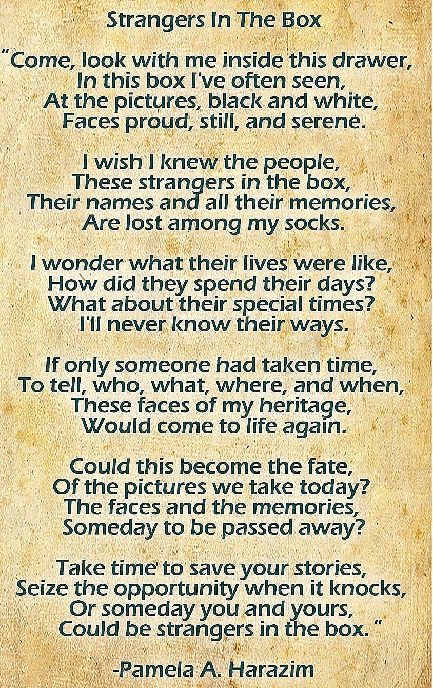 The poem will be a sharp reminder to some who have old photograph albums to make certain that name, places and events are recorded alongside the photos. Also if you have an album and cannot be bothered tracking down the names, hand it on to a family m