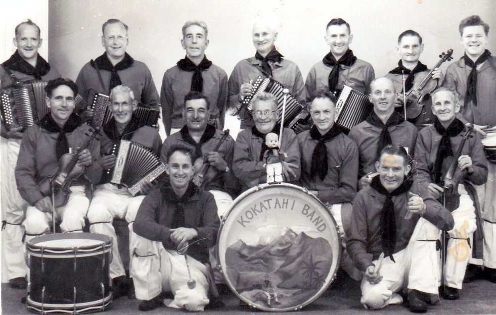 Back row l=r Ron Manley, Dave Chinn, Arnold Thompson, Jim Milner, Peter Kirwan, Ken McKey, Jack Tomlinson.Middle row l=r Jack Marshall, Les Inwood, Bill Wilson, Bill O'Brien, Merl Hutchison, Jack Innes, Jim Woolhouse, Kneeling Harry Sweney and Dave McLeod. Its the Kokatahi Band from 1962, new cover on the drum. From Boyangs n' Bandannas by Frank Graham published 2001
