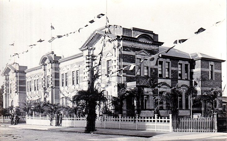 Hokitika council building decorated for the visit of the Prince of Wales in 1920.