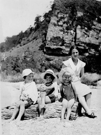 Jessie Thompson (nee McGregor), Beth Funnell (nee McGregor), Norma Whitehead (nee Kells), and Jessie Kells (nee Hill) on a beach