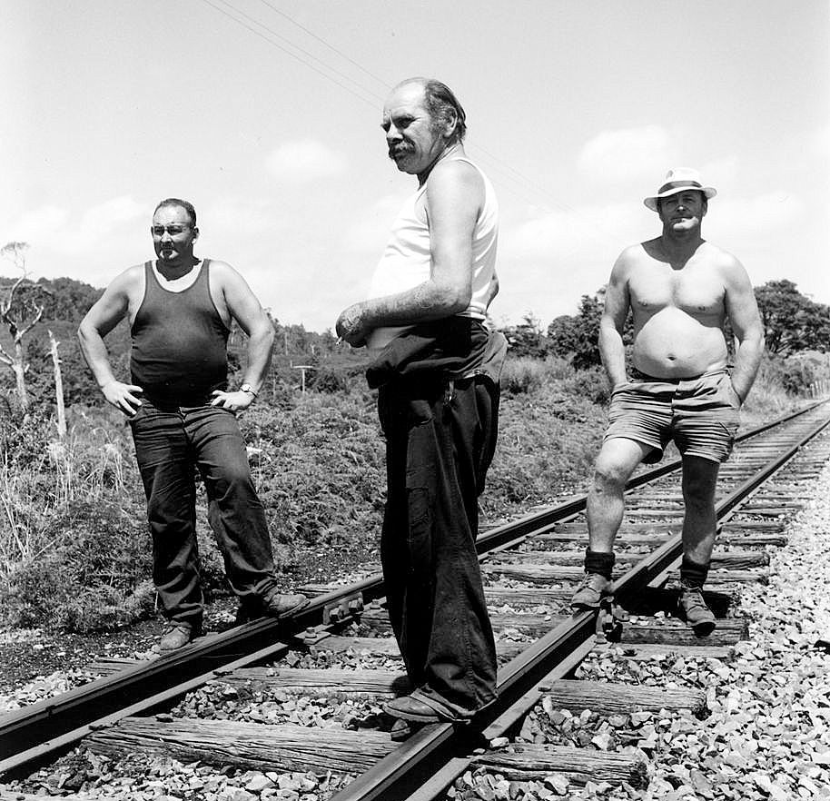 Railway workers - Joe Hill, Ivan Marley, Vic Townsend near Hokitika.1971.