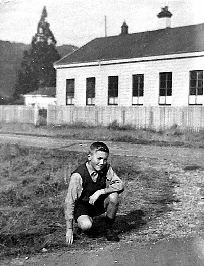 Joe Parkinson outside the school hall on the corner of Potter and Dick St, Reefton, ca 1940's.