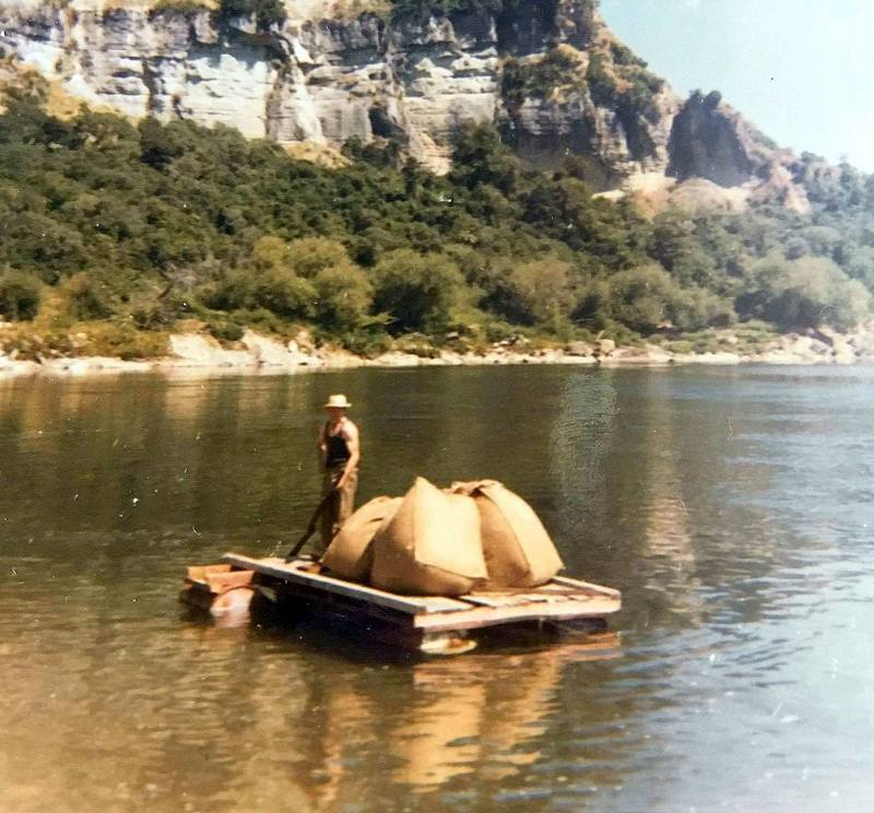 Kees Trompetter bringing the wool back over the Buller River at Whitecliffs area, ca 1960's.