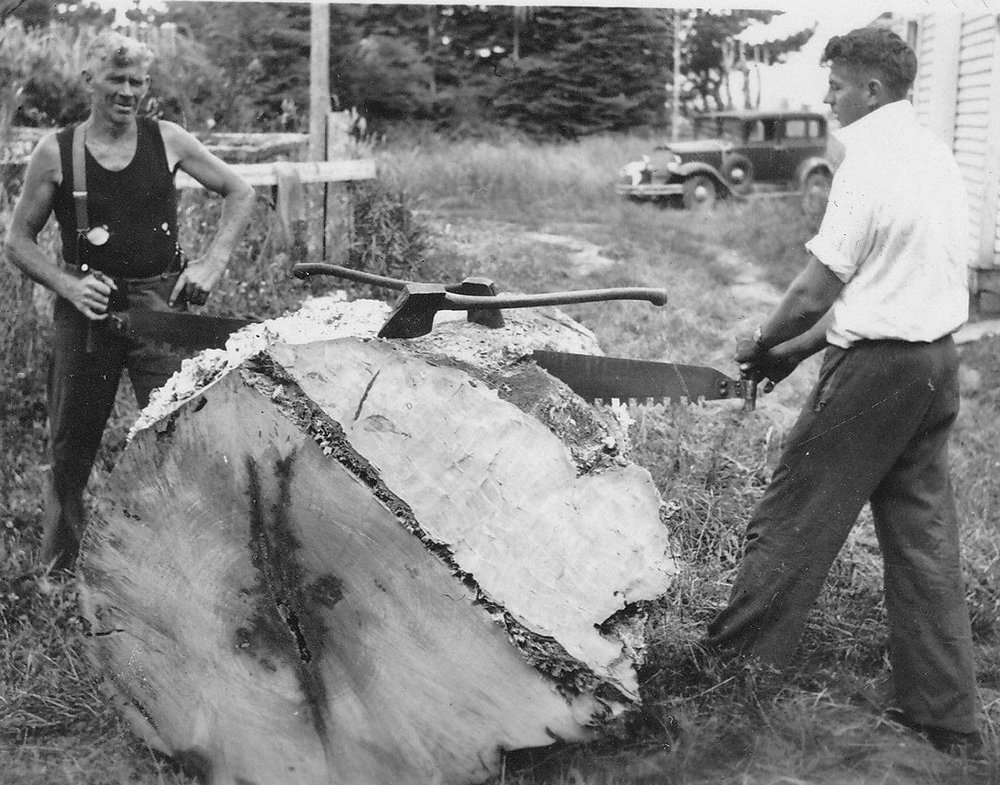 J P Curtain and J J Curtain cutting a matai for firewood, Whataroa