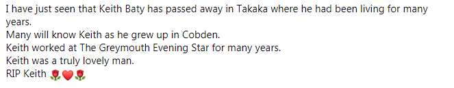 West Coast New Zealand History (8th Jul 2021). Keith Baty obituary. In Website West Coast New Zealand History. Retrieved 10th Apr 2026 01:05, from https://westcoast.recollect.co.nz/nodes/view/29615