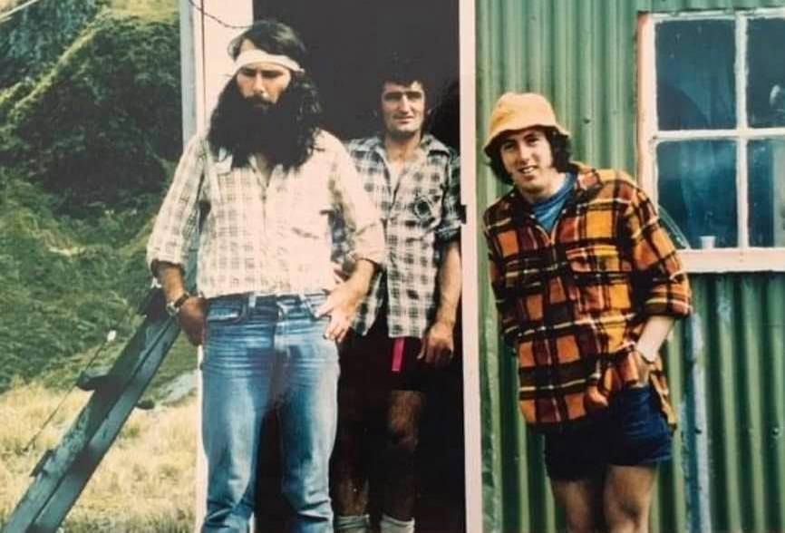 Glenn Lawson, Terry Sweetman and Neil Wallace at Terry's back country hut in Westland, about 1977