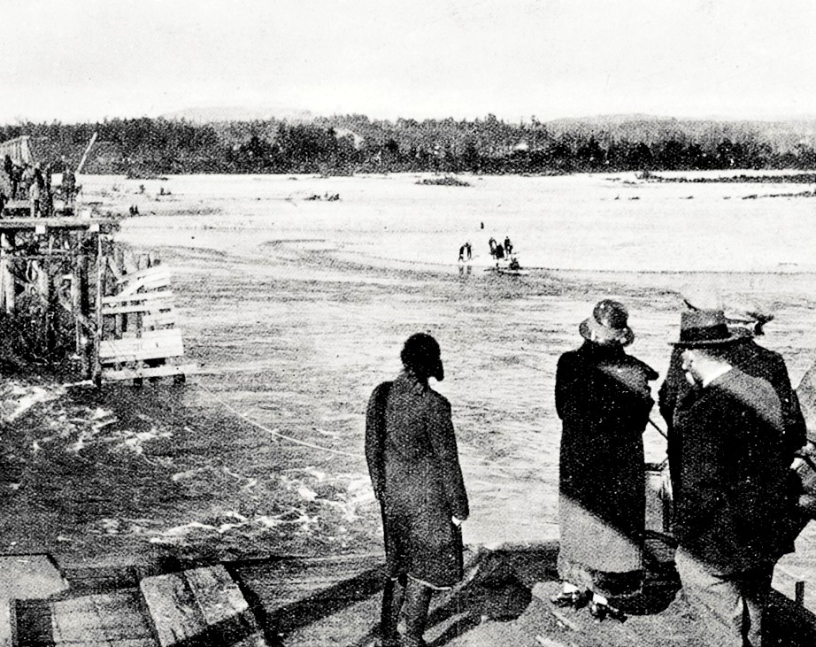 Blackball residents waiting to cross the broken bridge on the ropeway. 1926.