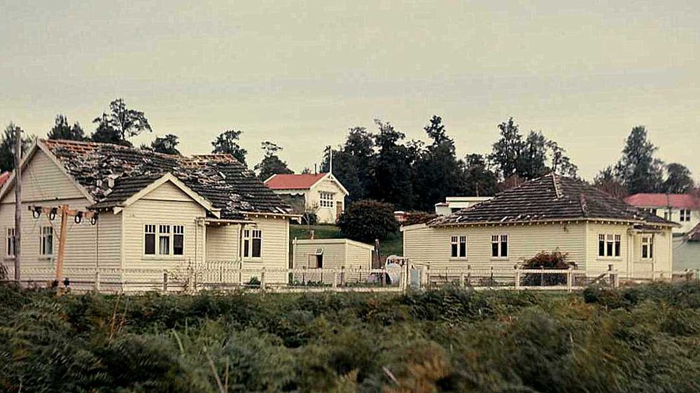 Damage to wooden houses in Inangahua owned by the Railways.1968.