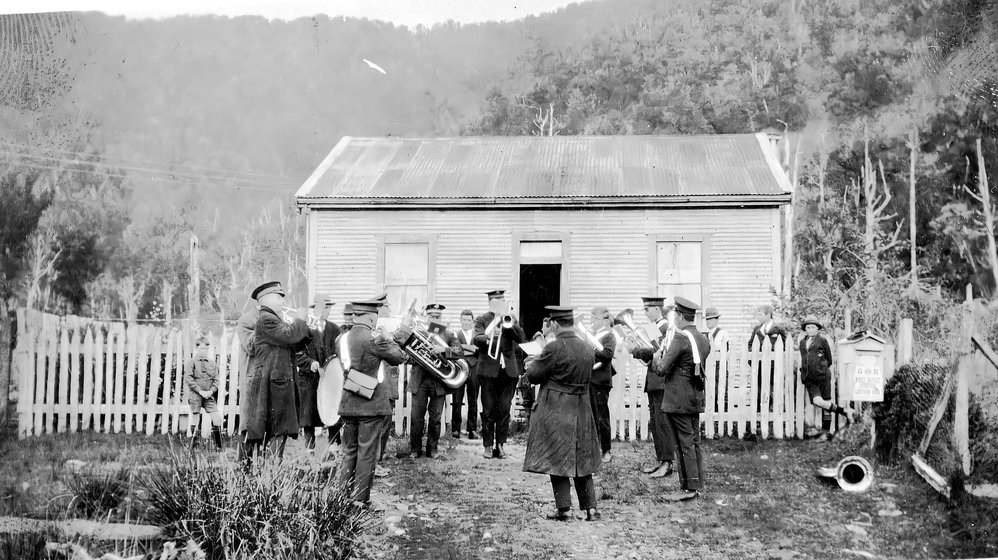 West Coast New Zealand History (29th Jul 2021). Mosely's house in Corbyvale, between Karamea and Mohikinui - with a visiting band.1920s. In Website West Coast New Zealand History. Retrieved 9th Apr 2026 17:41, from https://westcoast.recollect.co.nz/nodes/view/29722