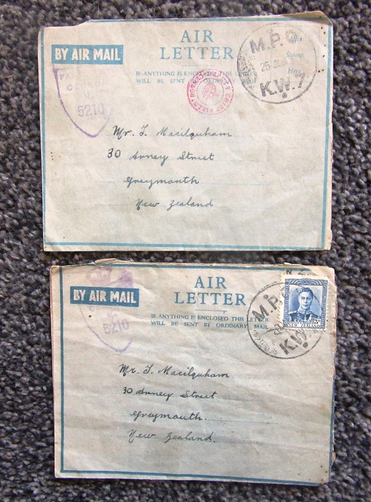 Two letters posted from World War 11 to Tom Macilquham, Arney St Greymouth.