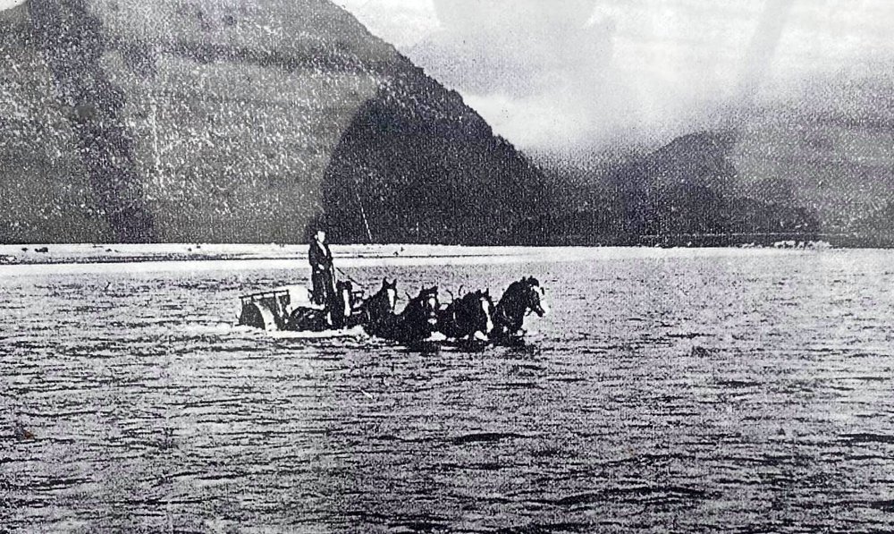 The river is fairly high. Two or three of those horses were around in my day. They were full draught.