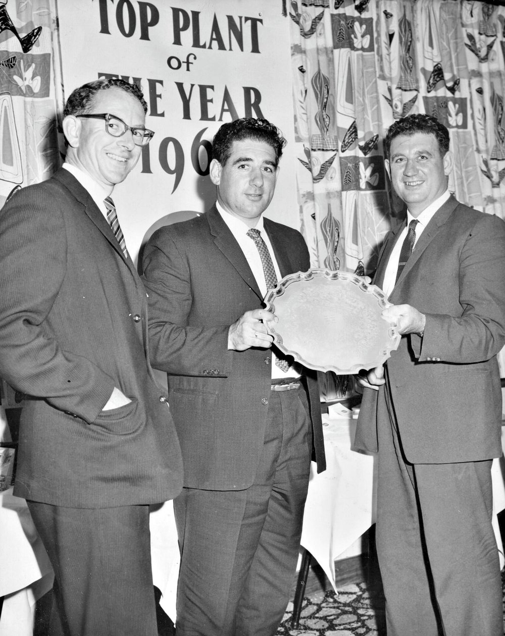 The Forrest brothers Nippy centre and Ray right being presented with a silver plate for selling the most Coca cola per capita.
