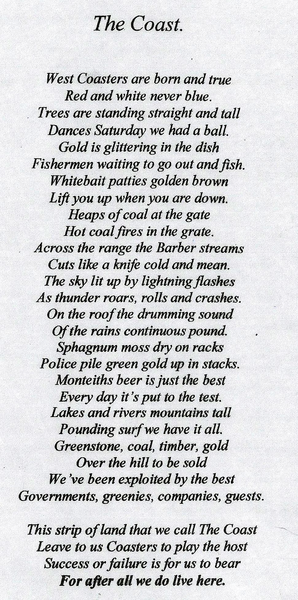 West Coast New Zealand History (5th Jan 2022). The Coast - a poem.. In Website West Coast New Zealand History. Retrieved 4th Apr 2026 16:31, from https://westcoast.recollect.co.nz/nodes/view/30320