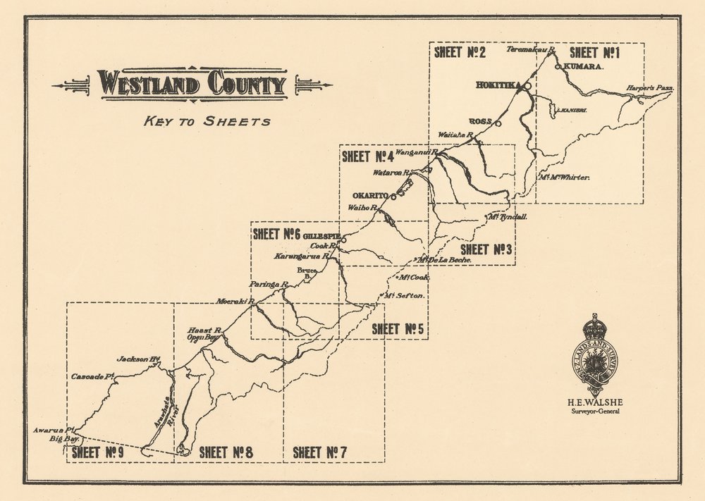 West Coast New Zealand History (4th Nov 2021). Westland County cadastral index map key diagram for county maps dated 1919-1935. In Website West Coast New Zealand History. Retrieved 7th Apr 2026 18:38, from https://westcoast.recollect.co.nz/nodes/view/30331