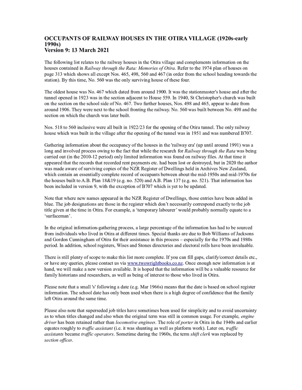 OCCUPANTS OF RAILWAY HOUSES IN THE OTIRA VILLAGE (1920s-early 1990s) The following list relates to the railway houses in the Otira village and complements information on the houses contained in Railway through the Rata: Memories of Otira. Refer to the 1974 plan of houses on page 313 which shows all except Nos. 465, 498, 560 and 467 (in order from the school heading towards the station). By this time, No. 560 was the only surviving house of these four. The oldest house was No. 467 which dated from around 1900. It was the stationmaster's house and after the tunnel opened in 1923 was in the section adjacent to House 559. In 1940, St Christopher's church was built on the section on the school side of No. 467. Two further houses, Nos. 498 and 465, appear to date from around 1906. They were next to the school fronting the railway. No. 560 was built between No. 498 and the section on which the church was later built. Nos. 518 to 560 inclusive were all built in 1922/23 for the opening of the Otira tunnel. The only railway house which was built in the village after the opening of the tunnel was in 1951 and was numbered B707. Gathering information about the occupancy of the houses in the 'railway era' (up until around 1991, by which time the houses in the village had been sold to Glenstone Holdings), has been a long and involved process owing to the fact that there is only limited information that can be gleaned from railway files (the records that recorded rent payments etc. appear to have been lost or destroyed). Thus, a large percentage of the information has had to be sourced from individuals who lived in Otira at different times. Special thanks to Bob Williams of Jacksons for his assistance in this process – especially for the 1970s and 1980s period. In addition, school registers, Wises and Stones directories have been invaluable and electoral rolls will be consulted to gain further information. The process is still far from finished but the list is now at a stage where the first version can be added to our website. Feedback is welcomed. If you can fill gaps, clarify/correct details etc., or have any queries, please send an email to info@twowrightbooks.co.nz . Once enough new information is at hand, we will make a new version available. It is hoped that the information will be a valuable resource for family historians and researchers, as well as being of interest to those who lived in Otira. In time, it is hoped to add information about other occupants of the village (e.g. NZED and singlemen's huts), to make a more complete record of those living in Otira. A lot of this information has already been sourced. Please note that a small 's' following a date (e.g. Mar 1966s) means that the date is based on school register information. The school date has only been used when there is a high degree of confidence that the family left Otira at the same time. Please also note that superseded job titles have sometimes been used for simplicity and to avoid uncertainty as to when titles changed and also when the original term was still in common usage. For example, engine driver has been retained rather than locomotive engineer. The role of porter in Otira in the 1940s and earlier equates roughly to traffic assistant (i.e. it was shunting as well as platform work). Later on, traffic assistants became traffic operators. Sometime during the 1960s, the term shift clerk was replaced by section officer. HOUSE WANTED! The following have not been able to be placed in a house with any certainty. If you can help, please let us know. 1920s and 1930s: Henry & Blanche Abrahams (1923-ca. 1928) engine driver, in a square house on river side down from the lower alleyway. Another engine driver, Bill Young and family, were in the next house up Charles & … Brown (ca. 1924-ca. 1937) near school (560?), Superintendent of Power House Patrick? Hughes & family (Jan/Feb 1930s- ?) train examiner Henry/Harry Madden & family (May 1932s-Oct 1937s) to Wellington, engine driver John Yardley & family (? -Dec 1935s), fitter Ernie Lancaster & family (? -Oct 1935s) to Lyttelton Senior family (Oct 1932s- ?) James Wearn (ca. 1927-ca. 1938) engine driver Samuel family (to June 1937) to Hamilton Garlick family (Aug/Sep 1933s-Dec 1935s) to Christchurch Burney family (Nov 1933s- ?) D C Kennedy & family (Jan/Feb 1935s - ?) guard Styris family (1935- ?) Le Fevre family (? - Jul 1937s) to Wellington 1940s: Smeaton family (Jul 1940s- ?) W Egan & family (early 1941- ?) house on railway side about 556, clerk William A Banks & family (early 1940s, there 1942) surfaceman Ted & … Burgess (ca. 1944-46) around 547/548, porter Cliff & … Crawford (early to mid-1940s) near 520, Traction electrician 1950s: Pat & … Riley (on railway side) 1956-58 era, not there long, in track gang 1960s: Ron and ... Jacques (on railway side in early 1960s) shunter? Peter and Merle Brown (on railway side in early 1960s) traffic assistant Albert and ... Huve (Jul 1968 – Nov/Dec 1969) – one of 544, 546, 550, 551, 552 or 553 surfaceman Trevor and ... Welsh (in area of 523 or 524 for about a year and a half – mid-1960s) surfaceman 1970s and 1980s: Dennis and … Oman – very early 1970s, on railway side Mark & V Sargisson – late 1970s, left about Mar/Apr 1980 traffic operator (house near bottom end on riverside) Graham Gordon (house near bottom end on riverside) there 1982, still there Aug 1987? (tunnel trip book) Ivan & Alison Bell Railway-side houses: 559: Jack & Nell Crook (Jun 1937-Feb 1944) lifter, Arthur & ... Lye (there by 1946-Dec 1948s) train examiner, L H (Les) & Marjorie Reeves (1949-1955) train examiner, G S (Graeme & Esther) Reeves (ca. 1955-25 Mar 1958) train examiner, V D (Viv) & Janice Stewart (26 Mar 1958-Jul 1962s) train examiner, George & ... Smith (Jul/Aug 1962s-June 1964s) train examiner, Tasmon & … Gadd (ca. 1964-ca. 1965), Joe Goodman (ca. 1966 (there in Aug 66)-Sep/Oct 1969) (plus Derek Albrechtsen) both engine drivers, G T (Geoff) & Liz 