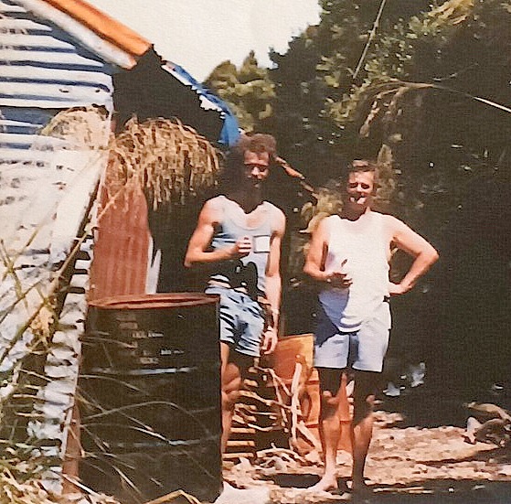 Tony Mac and I walked the track to the hut, approx 1hr 30mins, shorts tee shirts, back pack each, 12 pack DB a porterhouse steak each, bread buttered.