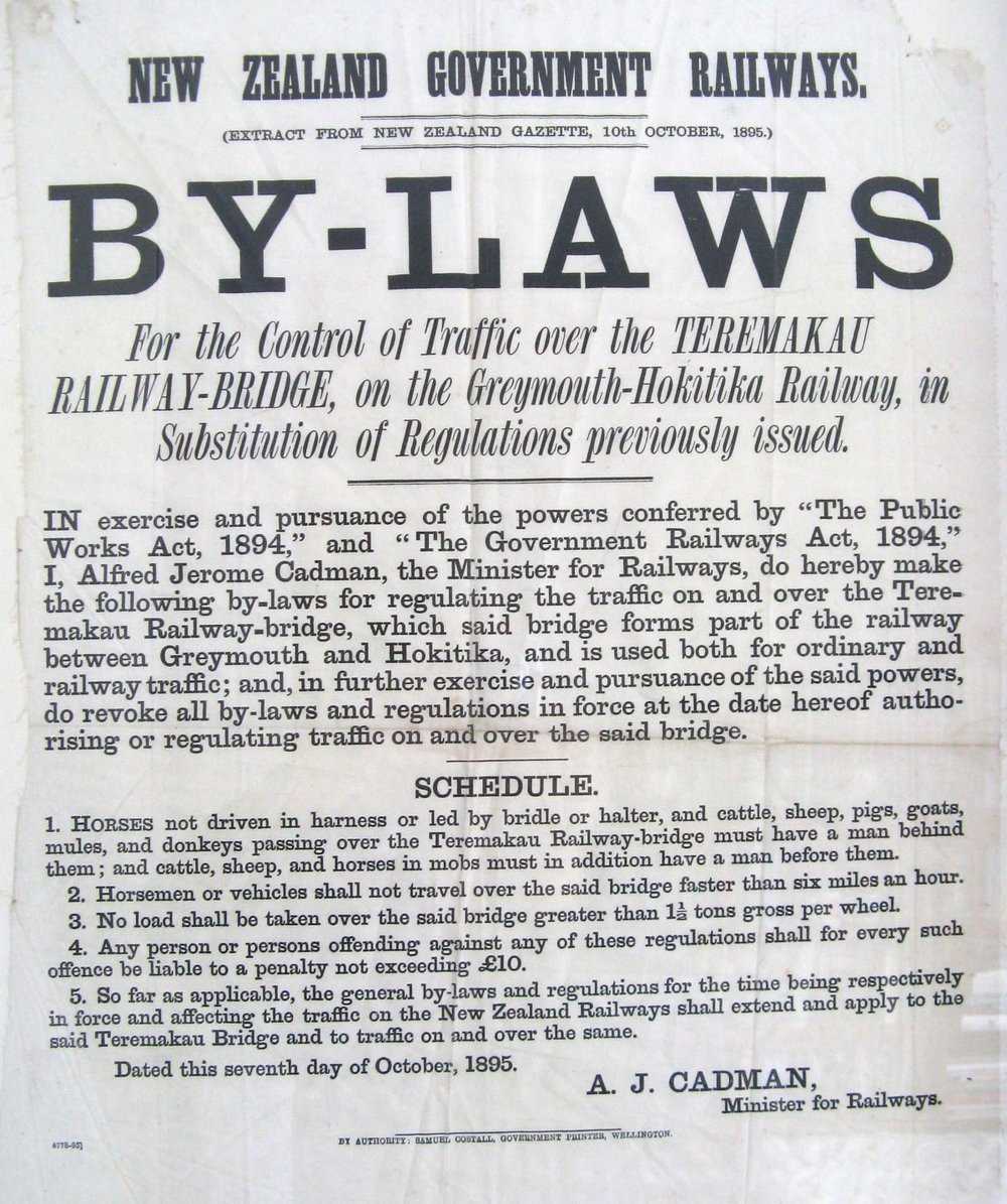 West Coast New Zealand History (22nd Jan 2022). Taramakau road rail bridge bylaws. In Website West Coast New Zealand History. Retrieved 7th Apr 2026 02:22, from https://westcoast.recollect.co.nz/nodes/view/30581