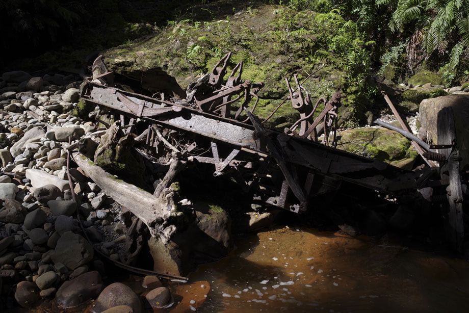 Remains of a 4- wheel centre rail brake 'Fell' van in Fords Creek Blackball