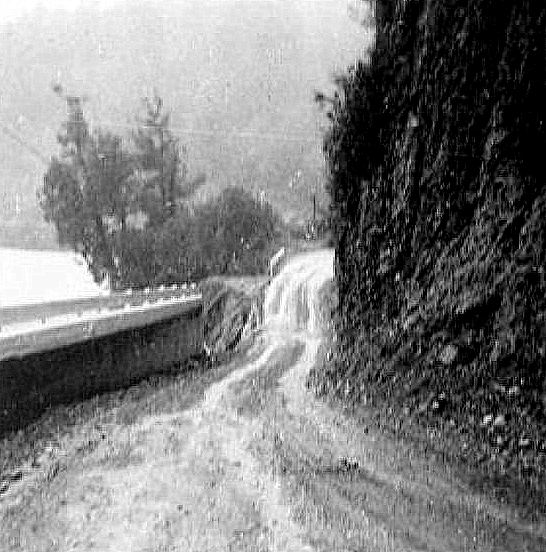 Washout of a thick concrete retainer wall in the Buller Gorge which was flooded and a raging torrent at the time.1971.