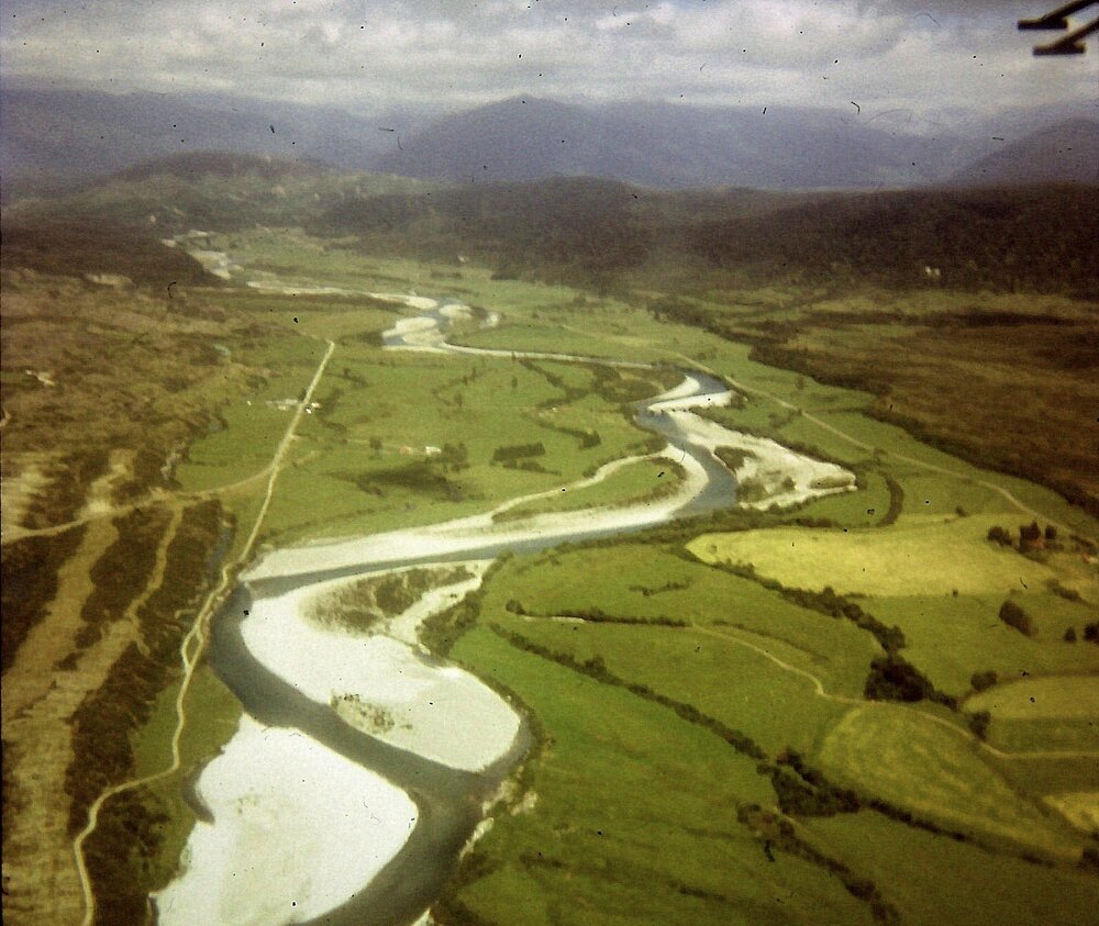 An old aerial photo of the Arahura valley which shows Malfroy's bridge center picture.