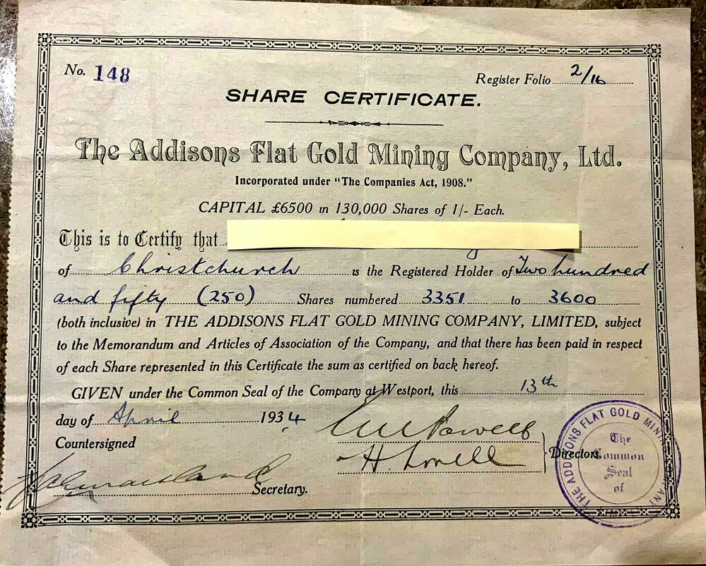 West Coast New Zealand History (17th Apr 2022). Addisons Flat Goldmining Company Ltd - Share Certificate.1934.. In Website West Coast New Zealand History. Retrieved 5th Apr 2026 08:00, from https://westcoast.recollect.co.nz/nodes/view/30914
