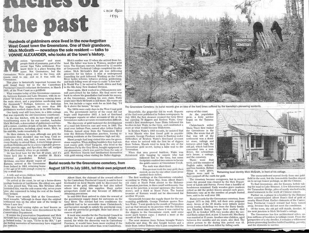 West Coast New Zealand History (19th Apr 2022). ALBUM - Goldminers town, The Greenstone between Kumara and Lake Brunner. Article and Photo in Chch Press 1996. In Website West Coast New Zealand History. Retrieved 5th Apr 2026 08:01, from https://westcoast.recollect.co.nz/nodes/view/30915