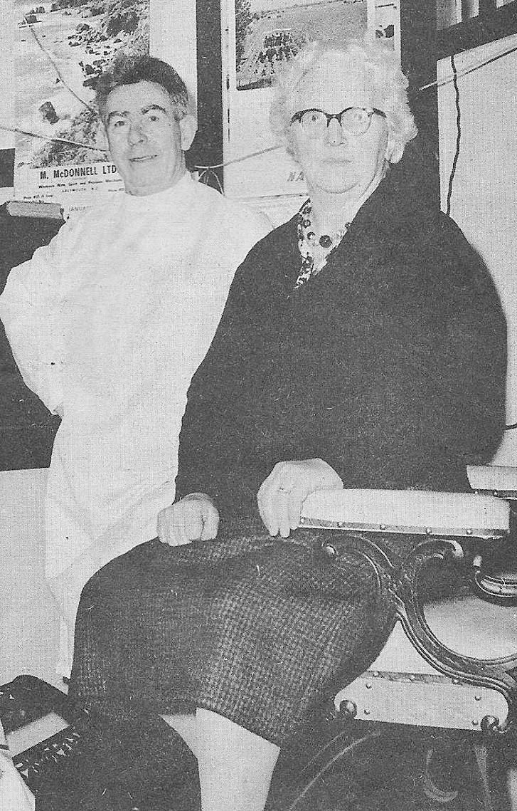 Mr and Mrs Eddie Flood in their Tainui Street hairdressing shop.1965.