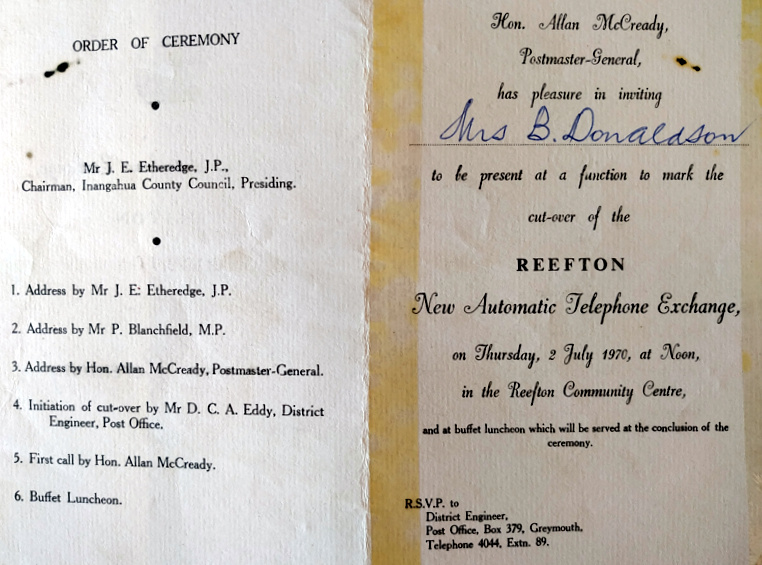 West Coast New Zealand History (26th Dec 2023). Cut over ceremony invitation of the Automatic Telephone Exchange,1970.. In Website West Coast New Zealand History. Retrieved 4th Apr 2026 17:21, from https://westcoast.recollect.co.nz/nodes/view/31087