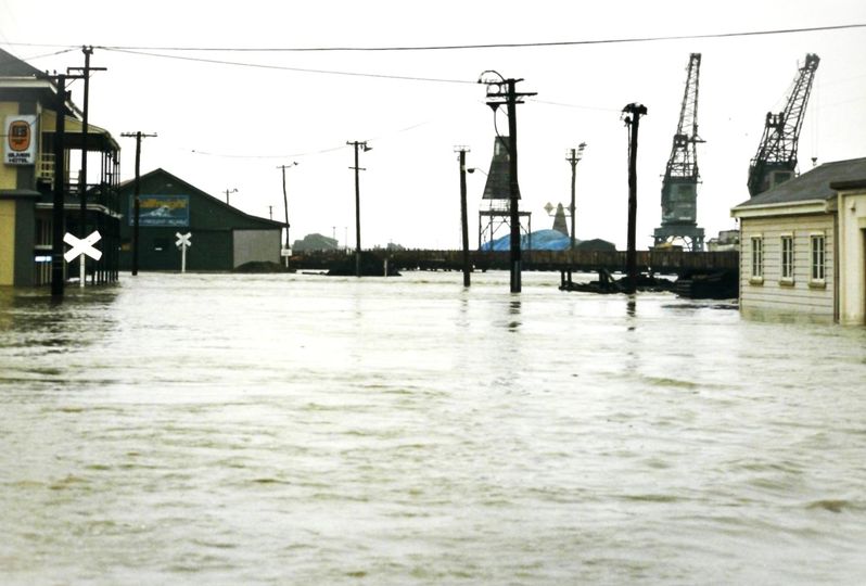 1988 Greymouth Flood - Gilmer Hotel - Good Sheds and cranes.