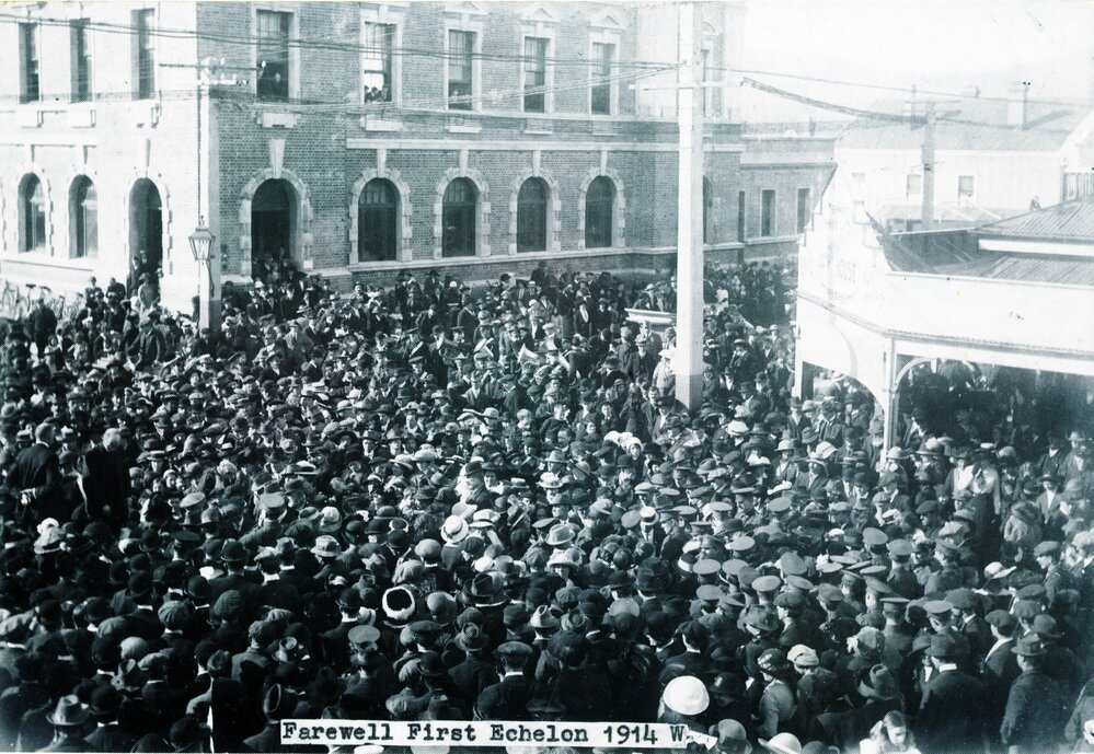 West Coast New Zealand History (22nd Jun 2022). Farewelling the First Echelon of soldiers leaving for the war - Post Office corner, Palmerston Street, Westport.1914.. In Website West Coast New Zealand History. Retrieved 4th Apr 2026 08:46, from https://westcoast.recollect.co.nz/nodes/view/31230