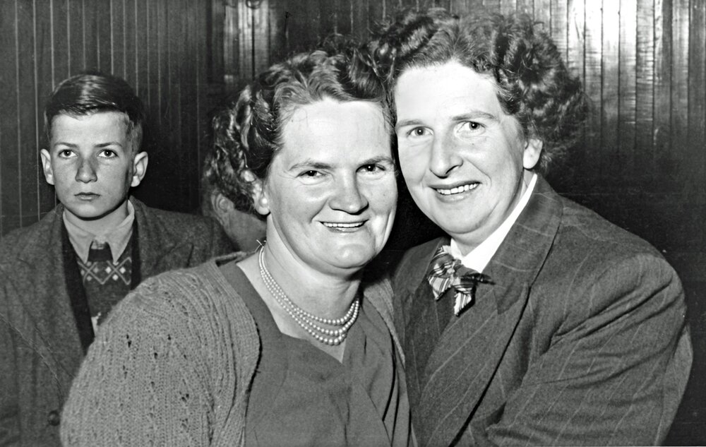 Jane Bell and her sister-in-law, Pat Molloy posing at the Moana Hall.1940`s.