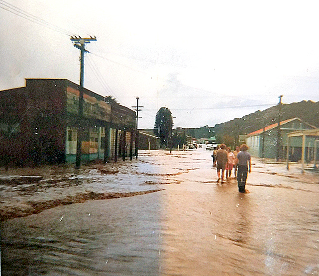 Looking down Smith St from Broadway during 1974 flood in Reefton.