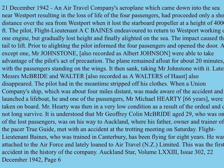 West Coast New Zealand History (6th Jul 2022). 1942 plane crash in sea off Westport. In Website West Coast New Zealand History. Retrieved 4th Apr 2026 05:30, from https://westcoast.recollect.co.nz/nodes/view/31278