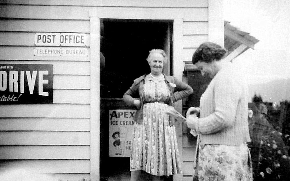 The Mawheraiti Post Office with Postmistress Mrs Elizabeth Summerville at the door