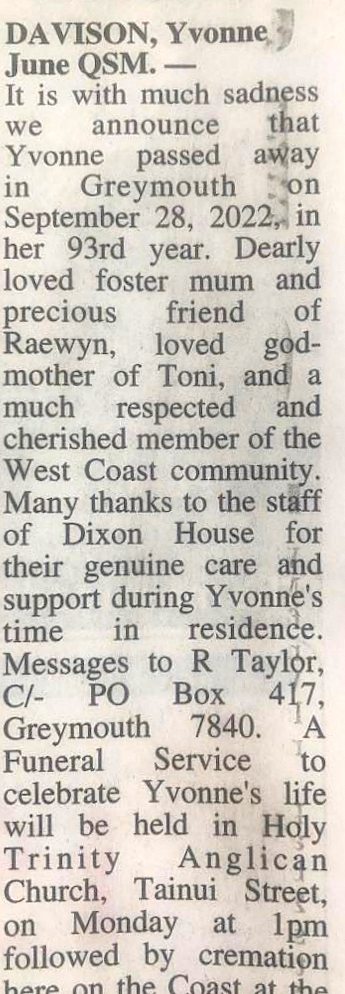 West Coast New Zealand History (1st Oct 2022). OBITUARY - Yvonne June Davison - September 28th, 2022.. In Website West Coast New Zealand History. Retrieved 3rd Apr 2026 12:19, from https://westcoast.recollect.co.nz/nodes/view/31481