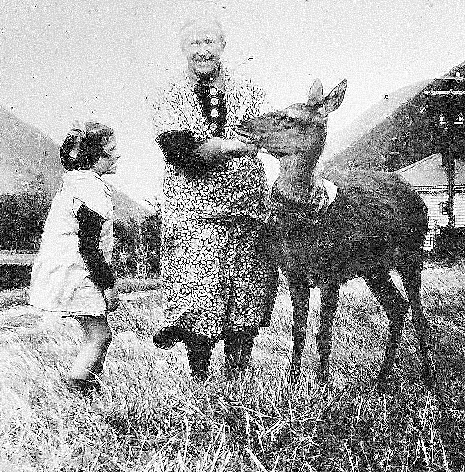 West Coast New Zealand History (2nd Aug 2023). Helen Brown and her Grandmother with Timoshenko the pet deer.Arthurs Pass.early 1940's. In Website West Coast New Zealand History. Retrieved 3rd Apr 2026 10:25, from https://westcoast.recollect.co.nz/nodes/view/31528