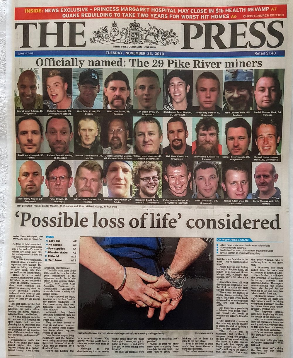 West Coast New Zealand History (16th Nov 2022). Pike River Coalmine disaster - Newspaper headlines.2010.. In Website West Coast New Zealand History. Retrieved 3rd Apr 2026 04:22, from https://westcoast.recollect.co.nz/nodes/view/31602