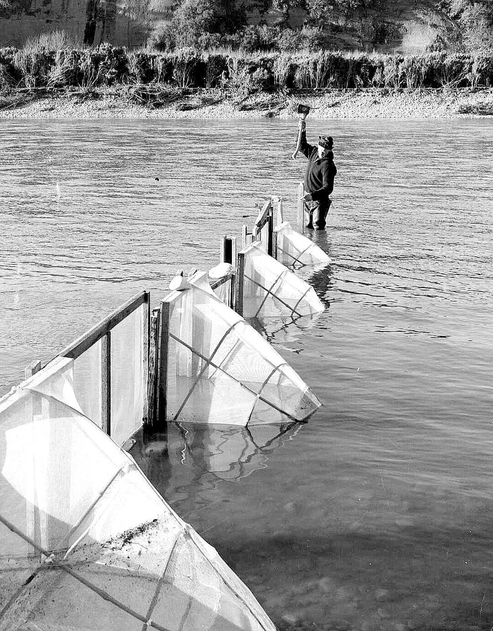 R Biddington placing whitebait nets apart in the Taramakau River.ca.1958.