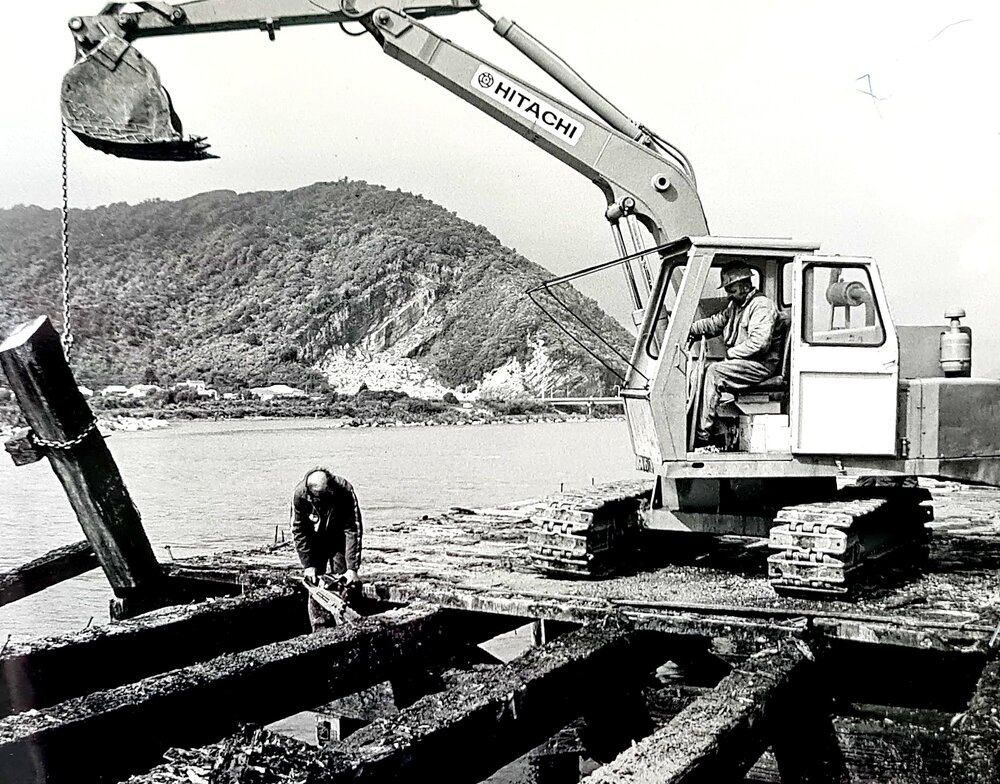 Dismantling Greymouth Wharf with operational Cobden Quarry in background.1987.