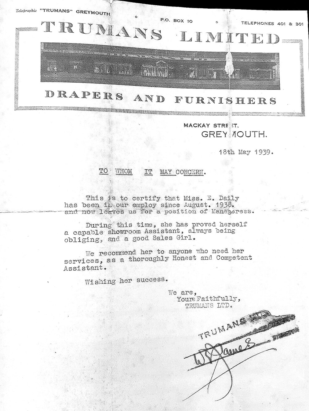 Description My mother, Eva Power nee Daily worked at Truman's 1938- 1939 prior to her marriage at the end of 1940. Does anyone know when Truman's opened in Westport? The letterhead (see photo) says Truman's Greymouth which may have been the head office. I think it is more likely she worked at Truman's Westport. I would appreciate your thoughts.