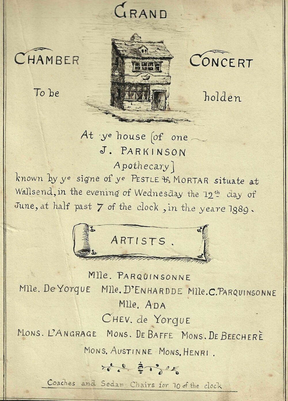 An invitation to a chamber music evening at the Parkinsons of Wallsend,12 June,1889. Brunner.