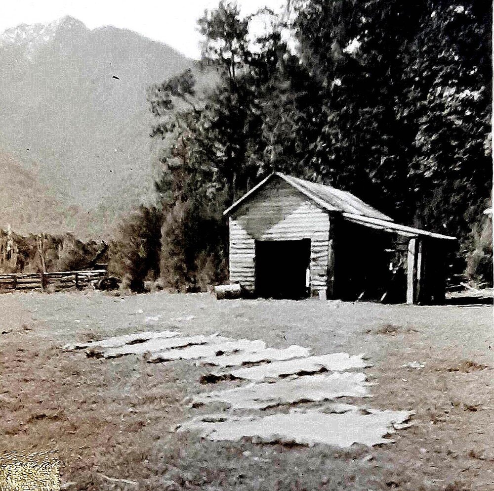 Deerskins in front of an old shed at Newcombes near Springs Junction.