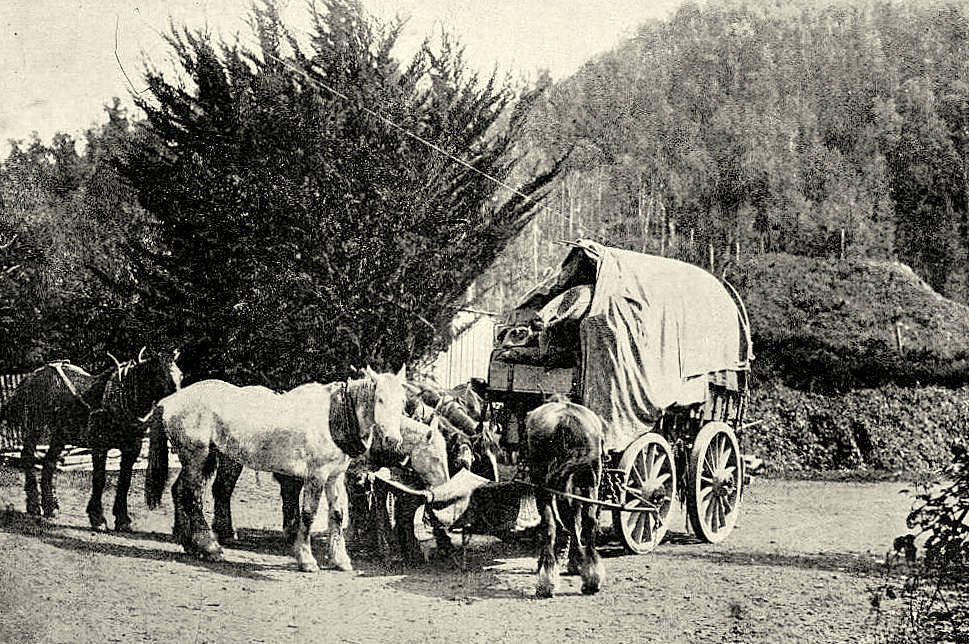 Feeding time in the Buller Gorge, on the road between Westport and Reefton.1903.