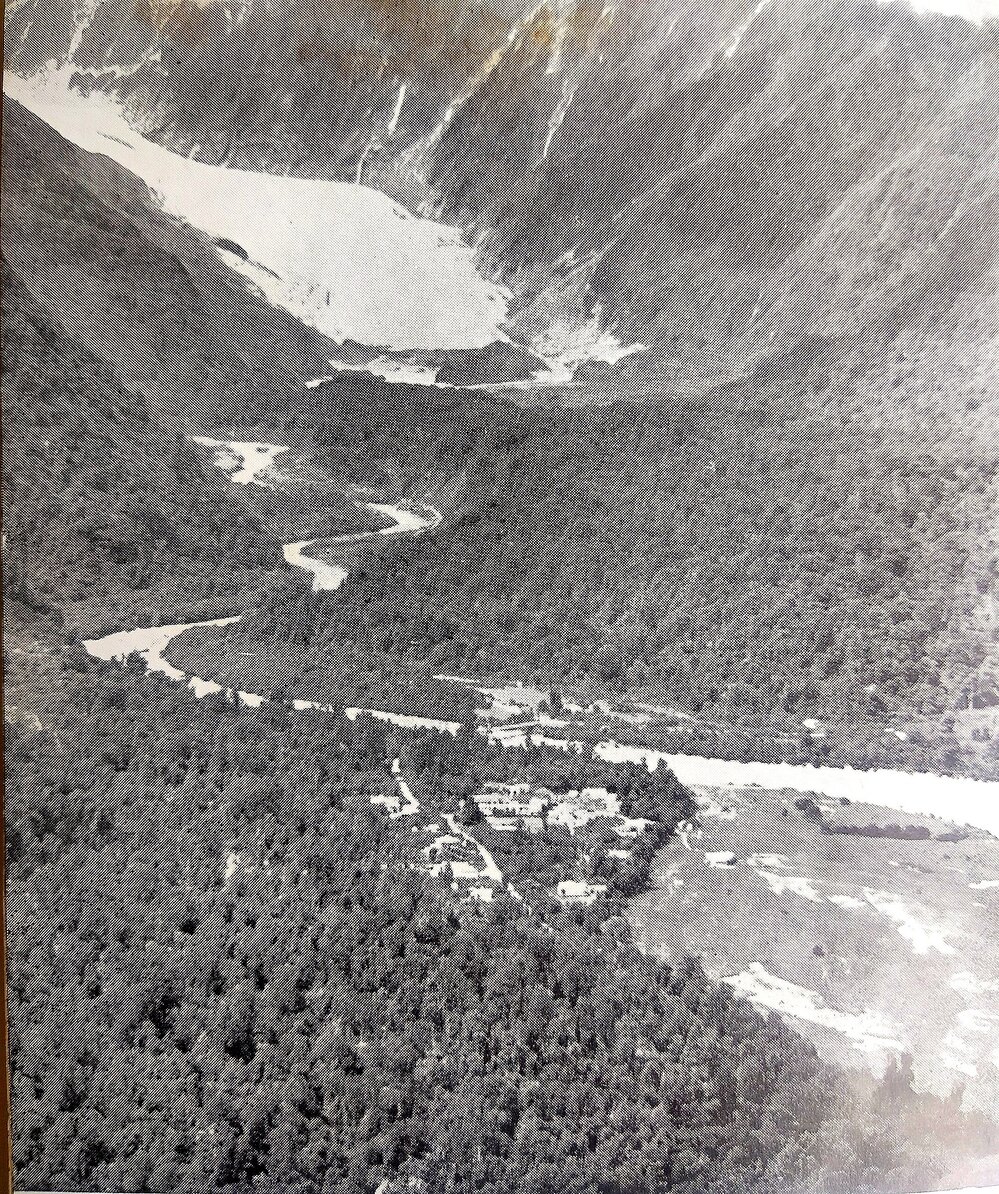 Aerial photo of the Franz Joseph Glacier and the township.1950.