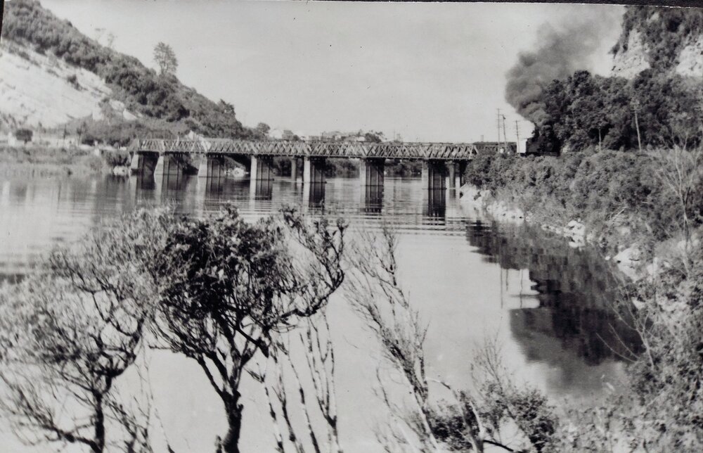 Miners train crossing Grey River on the way to Rewanui in the late 1960s