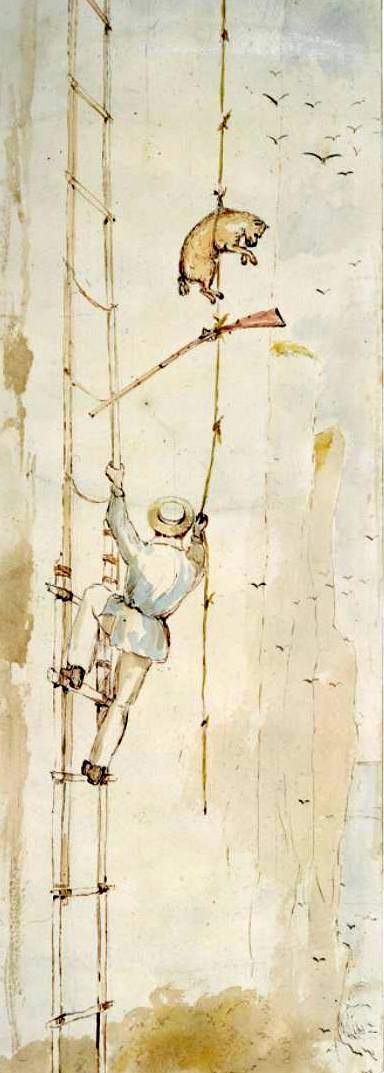 Thomas Brunner and 'Rover' ascend Te Miko Cliff (Perpendicular Point).1846.